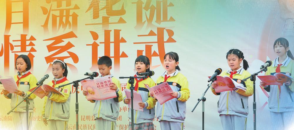 云南陆军讲武堂小讲解员朗诵诗歌。陈飞 摄