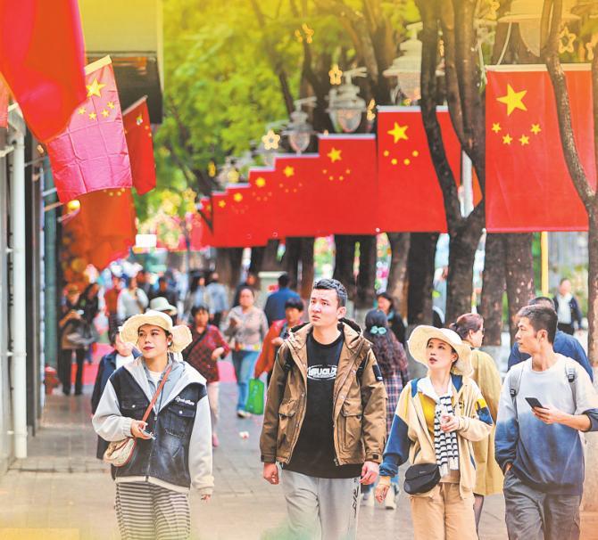 昆明南屏街上,鲜艳的五星红旗形成一道红色风景线。胡妤雅 陈飞 摄
